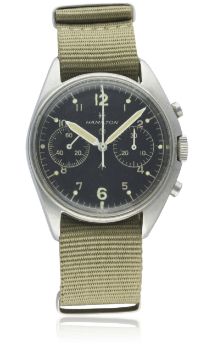 A GENTLEMAN'S STAINLESS STEEL BRITISH MILITARY HAMILTON CHRONOGRAPH WRIST WATCH DATED 1970 D: Black dial with Arabic numerals & tritium luminous markers, military arrow, double register recording minutes & continuous seconds. M: 17 jewel manual wind movement signed Hamilton, Valjoux calibre 7733. C: Asymmetric military case with fixed bars, numbered, issue markings W10/6645-99-924-3306 ^ 247/70, case diameter measures approx. 39mm. S: NATO strap.CONDITION REPORTD: Original dial in excellent condition. M: Working at present. C: In excellent condition with some scratches due to general use. S: New. D: Dial / M: Movement / C: Case / S: Strap / B: Bracelet