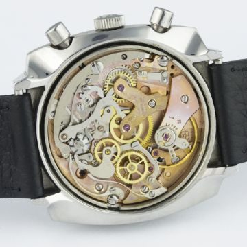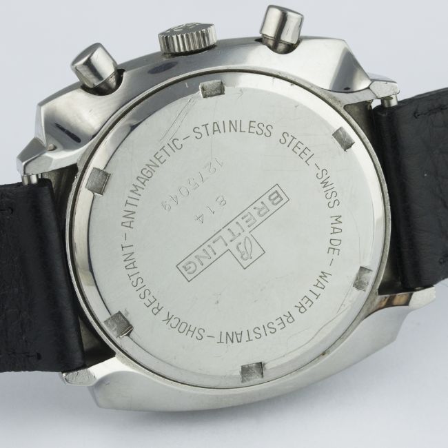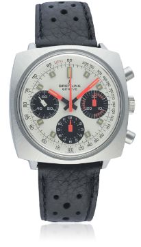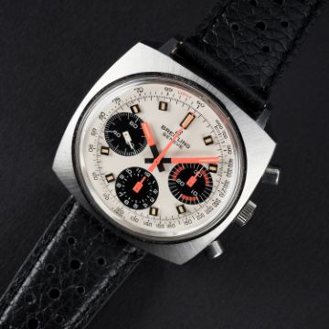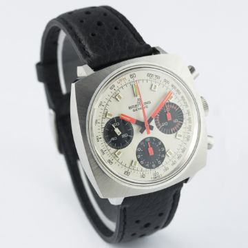 A RARE GENTLEMAN'S STAINLESS STEEL BREITLING TOP TIME CHRONOGRAPH WRIST WATCH CIRCA 1969, REF. 814D: Silver "panda" dial with luminous inlaid silver markers & orange hands, three black registers recording hours, minutes & continuous seconds, outer tachymetre scale. M: 17 jewel manual wind movement signed Breitling Watch Ltd, Venus calibre 178. C: Cushion shaped screw back case, signed Breitling & numbered, original crown & pushers, case width measures approx. 38mm. S: Black perforated leather strap.CONDITION REPORTD: Original dial in excellent condition. M: Working at present. C: In excellent condition. S: In excellent condition. D: Dial / M: Movement / C: Case / S: Strap / B: Bracelet