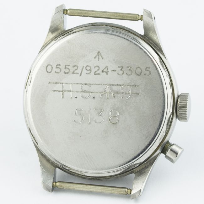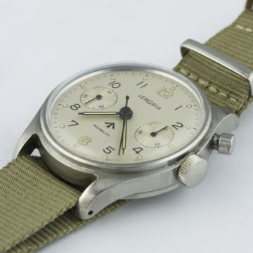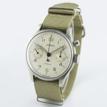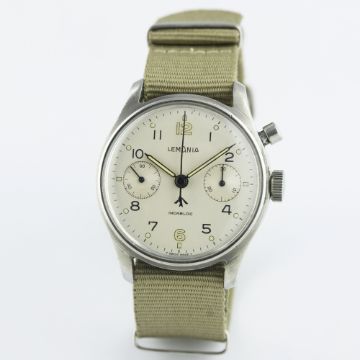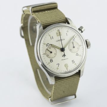 D: Silver dial with Arabic numerals & luminous markers & hands, military arrow, double register recording minutes & continuous seconds. M: 17 jewel manual wind incabloc movement signed Lemania Watch Co, calibre 2220. C: Circular case with issue markings ^ 0552/924-3305 5138 (H.S. ^ 9 crossed out), case diameter measures approx. 39mm. S: NATO strap.