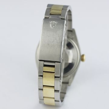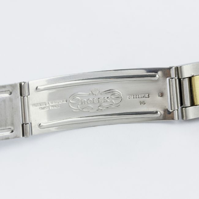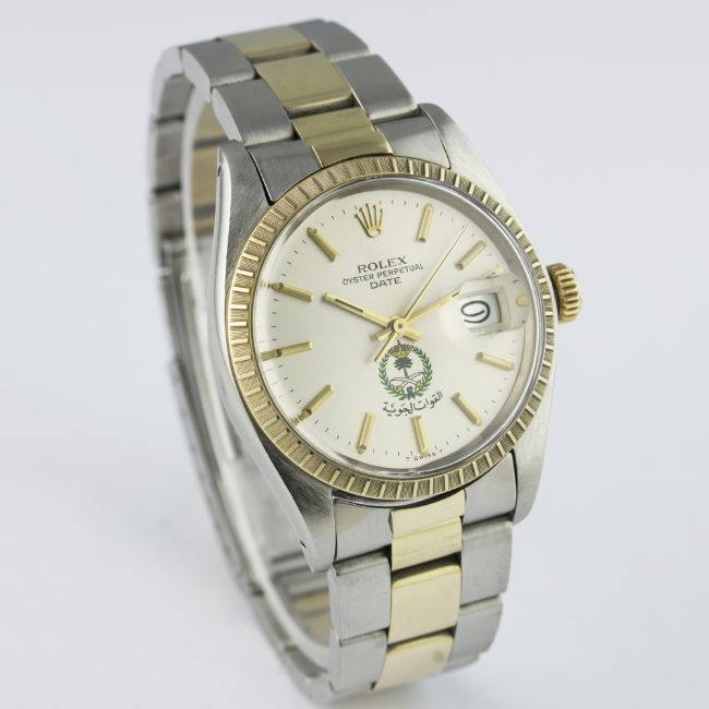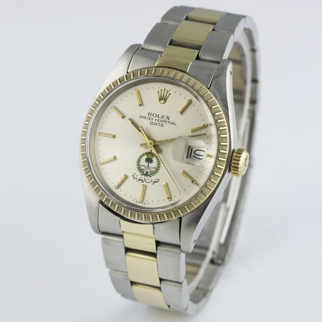 A RARE GENTLEMAN'S STEEL & GOLD ROLEX OYSTER PERPETUAL DATE BRACELET WATCH CIRCA 1977, REF. 1505 COMMISSIONED BY THE SAUDI MILITARY AIR FORCED: Silver dial with gilt batons & hands, Saudi Military crest, date aperture. M: 26 jewel automatic movement, signed Rolex S.A. & numbered, calibre 1570. C: Oyster case with solid gold milled bezel, signed Montres Rolex S.A. & numbered, Rolex crown, case diameter measures approx. 35mm B: Original Rolex Oyster steel and solid gold bracelet, numbered 14/78353/19/457.CONDITION REPORTD: Original dial in excellent condition. M: Working at present. C: In excellent condition. S: In excellent condition with some light scratches due to general use. D: Dial / M: Movement / C: Case / S: Strap / B: Bracelet