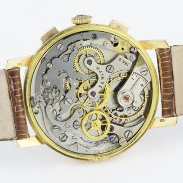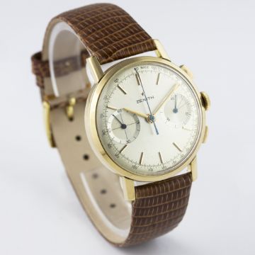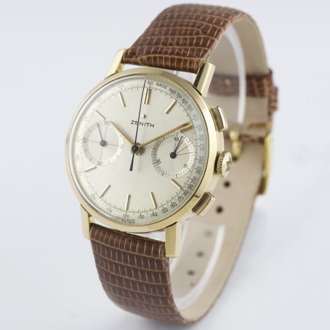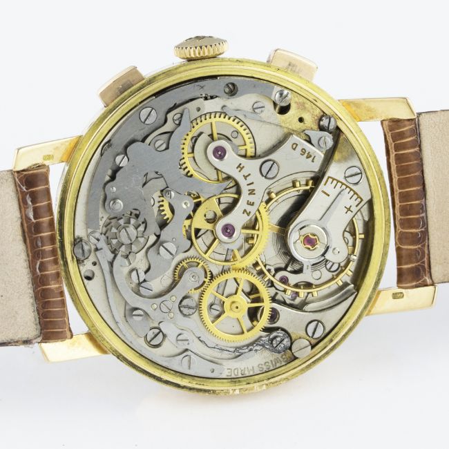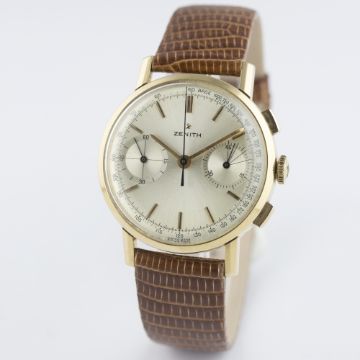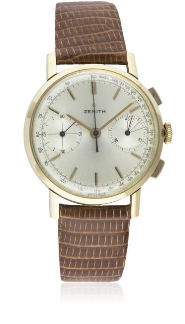 A GENTLEMAN'S 18K SOLID PINK GOLD ZENITH CHRONOGRAPH WRIST WATCH CIRCA 1960s D: Silver sunburst dial with pink gold batons & hands, double register recording minutes & continuous seconds, outer tachymetre scale. M: Manual wind movement signed Zenith, calibre 146D. C: Circular case, signed Zenith & numbered, 18k hallmarks, original crown & pushers, case diameter measures approx. 35mm. S: Brown leather strap.CONDITION REPORTD: Original dial in very good condition, showing some small signs of age. M: Working at present. C: In excellent condition, with some light scratches due to general use. S: In excellent condition. D: Dial / M: Movement / C: Case / S: Strap / B: Bracelet