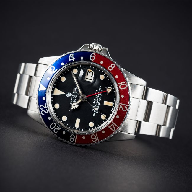 A GENTLEMAN'S STAINLESS STEEL ROLEX OYSTER PERPETUAL DATE GMT MASTER BRACELET WATCH CIRCA 1965, REF. 1675 WITH LATER ROLEX DIAL & HANDSD: Matt black dial with luminous markers & Mercedes hands, dual time zone arrow hand, date aperture. M: 26 jewel automatic chronometer movement, signed Montres Rolex S.A. & numbered, calibre 1570. C: Oyster case with 24 hour rotating "Pepsi" bezel, signed Montres Rolex S.A., dated IV.65, numbered, Rolex crown, case diameter measures approx. 40mm. B: Rolex Oyster bracelet, numbered P11/78360/280.CONDITION REPORTD: Later Rolex dial & hands (from the 1970s) in excellent condition, luminous showing a nice patina. M: Working at present. C: In good condition, some corrosion on the inside edge of the case back. B: In very good condition, with some light wear to the links due to general use. D: Dial / M: Movement / C: Case / S: Strap / B: Bracelet