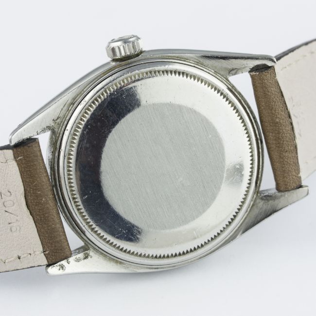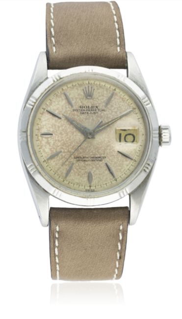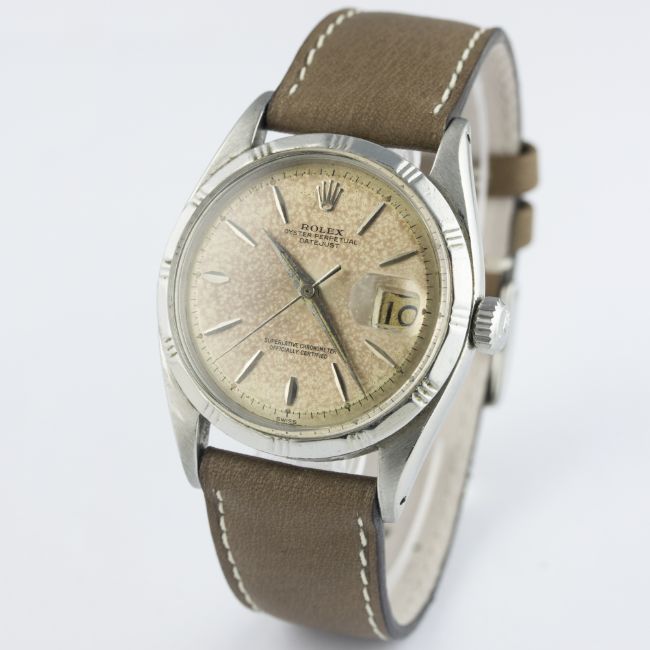 A RARE GENTLEMAN'S STAINLESS STEEL ROLEX OYSTER PERPETUAL DATEJUST WRIST WATCH CIRCA 1963, REF. 1603 D: Silver "tropical" dial with silver faceted batons & dauphine hands, date aperture. M: 25 jewel automatic chronometer movement with "butterfly" rotor, signed Rolex Geneva & numbered, calibre 1560. C: Oyster case with milled bezel, signed Montres Rolex S.A., dated I.60, serial number is worn, Rolex crown, case diameter measures approx. 36mm S: Brown leather strap.CONDITION REPORTD: Original dial in good "tropical" condition. M: Working at present. C: In very good condition with some scratches due to general use. S: In excellent condition. D: Dial / M: Movement / C: Case / S: Strap / B: Bracelet