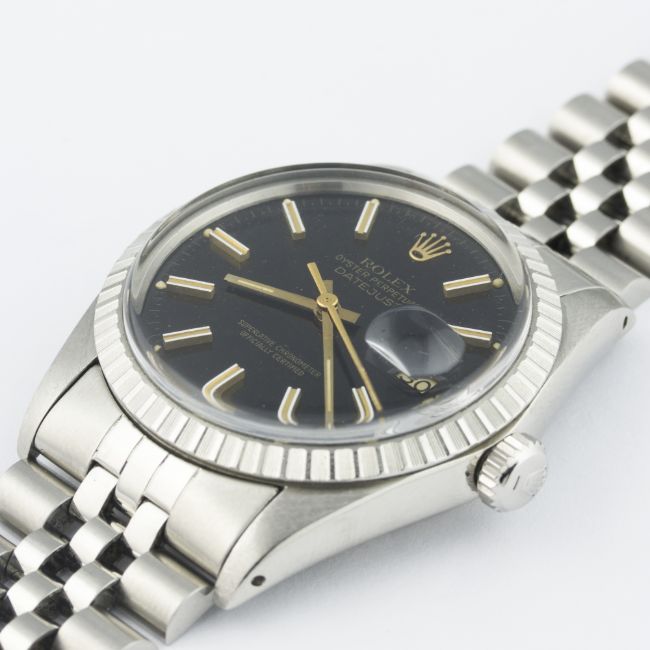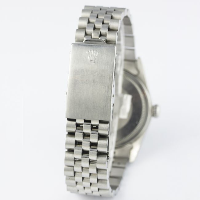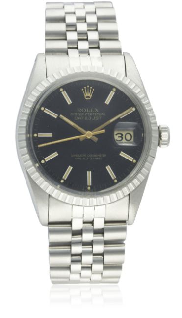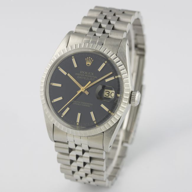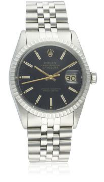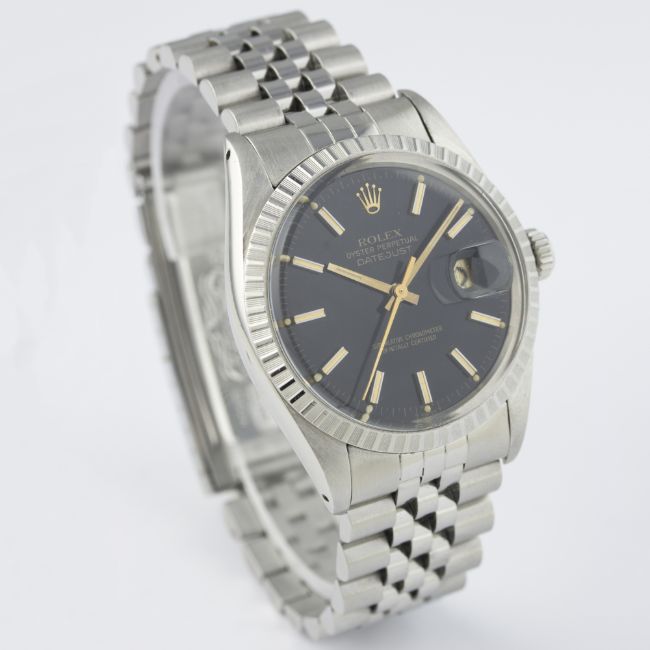 A RARE GENTLEMAN'S STAINLESS STEEL ROLEX OYSTER PERPETUAL DATEJUST BRACELET WATCH CIRCA 1980, REF. 16030 D: Black dial with white inlaid gilt batons, gilt font & tracking, date aperture. M: 27 jewel automatic chronometer movement with quick-set date, signed Rolex S.A., calibre 3035. C: Oyster case with milled bezel, signed Montres Rolex S.A., numbered, Rolex crown, case diameter measures approx. 36mm. B: Rolex Jubilee bracelet, numbered 62510H/555.CONDITION REPORTD: Original dial in excellent condition. M: Working at present. C: In excellent condition, with some light scratches due to general use. B: In very good condition. D: Dial / M: Movement / C: Case / S: Strap / B: Bracelet
