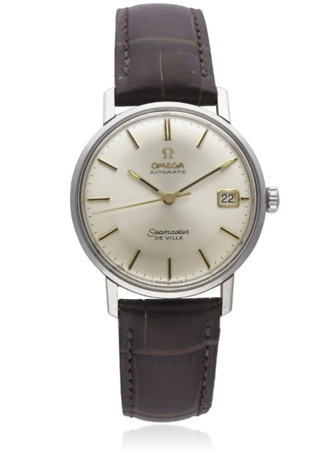A GENTLEMAN'S STAINLESS STEEL OMEGA SEAMASTER DE VILLE AUTOMATIC WRIST WATCH CIRCA 1960s, WITH OMEGA BOX D: Silver dial with black inlaid gilt batons & hands, date aperture. M: Automatic movement, signed Omega Watch Co. & numbered. C: Circular case with Seamaster emblem embossed on case back, signed Omega Watch Co., Omega crown, case diameter measures approx. 35mm. S: Brown leather strap. CONDITION REPORTD: Original dial in excellent condition. M: Working at present. C: In very good condition. S: In excellent condition. D: Dial / M: Movement / C: Case / S: Strap / B: Bracelet