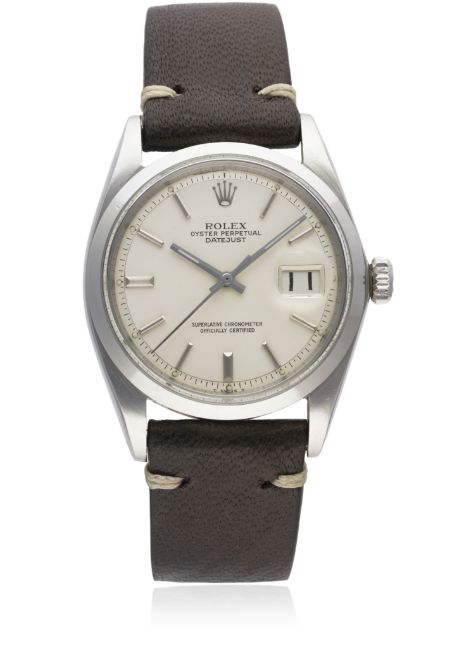 A GENTLEMAN'S STAINLESS STEEL ROLEX OYSTER PERPETUAL DATEJUST WRIST WATCH CIRCA 1968, REF. 1600 D: Silver dial with silver batons & hands, date aperture. M: 26 jewel automatic chronometer movement, signed Montres Rolex S.A. & numbered, calibre 1570. C: Oyster case with smooth bezel, signed Montres Rolex S.A., dated II.68, numbered, Rolex crown, case diameter measures approx. 36mm S: Brown leather strap.  CONDITION REPORTD: Original dial in excellent condition. M: Working at present. C: In excellent condition, with some light scratches due to general use. S: In excellent condition. D: Dial / M: Movement / C: Case / S: Strap / B: Bracelet