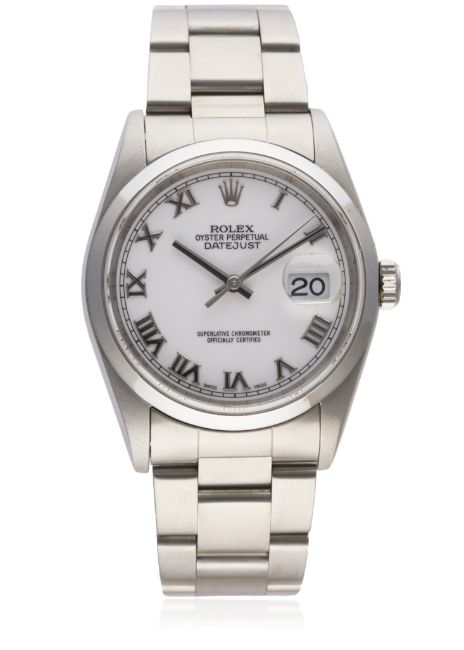 A GENTLEMAN'S STAINLESS STEEL ROLEX OYSTER PERPETUAL DATEJUST BRACELET WATCH DATED 2005, REF. 16200 WITH BOX & PAPERSD: White dial with black inlaid white gold Roman numerals & hands, date aperture. M: 31 jewel automatic chronometer movement with quick set date, signed & numbered, calibre 3135. C: Oyster case with smooth bezel, sapphire crystal, signed Montres Rolex S.A., D serial no., Rolex crown, case diameter measures approx. 36mm B: Rolex Oyster bracelet, clasp numbered MA5/78360/558B. CONDITION REPORTD: Original dial in excellent condition. M: Working at present. C: In excellent condition. B: In excellent condition. D: Dial / M: Movement / C: Case / S: Strap / B: Bracelet