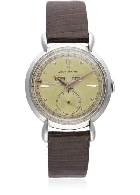 A VERY RARE GENTLEMAN'S LARGE SIZE STAINLESS STEEL JAEGER LECOULTRE TRIPLE CALENDAR WRIST WATCH CIRCA 1940s D: Two tone silver dial with pink gold markers & dauphine hands, outer date calendar, day & month apertures, subsidiary seconds. M: Manual wind movement, signed Jaeger-LeCoultre & numbered, calibre P484/1A. C: Circular case with "teardrop" lugs, signed Fab. Suisse & numbered, case diameter measures approx. 36mm. S: Brown leather strap. CONDITION REPORTD: Original dial in very good condition, showing some small signs of age & patina. M: Working at present. C: In excellent condition. S: In excellent condition. D: Dial / M: Movement / C: Case / S: Strap / B: Bracelet