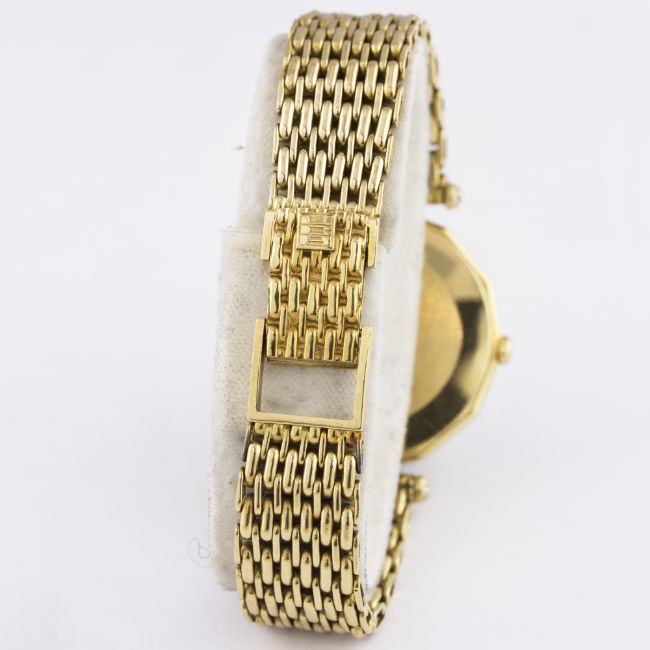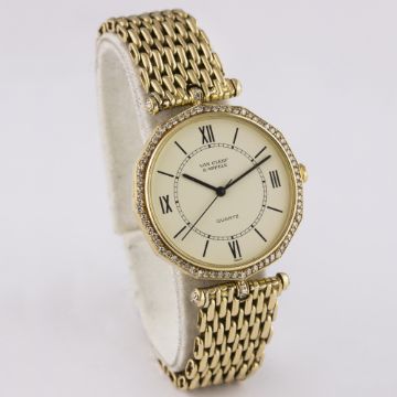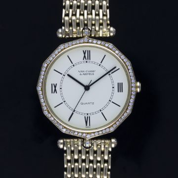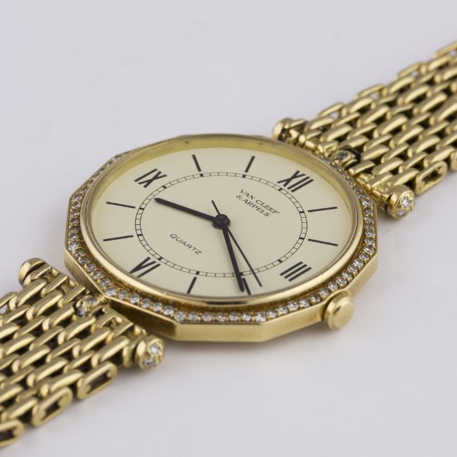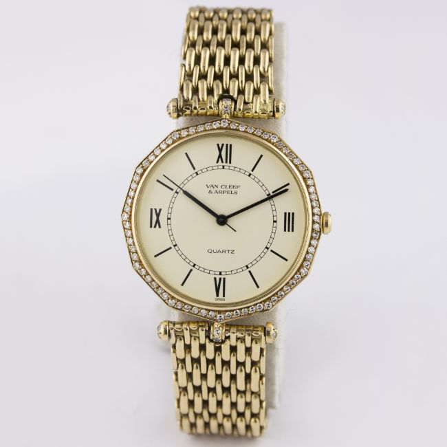 A GENTLEMAN'S SIZE 18K SOLID GOLD & DIAMOND VAN CLEEF & ARPELS BRACELET WATCH CIRCA 1990s D: Ivory colour dial with quarterly Roman numerals & markers, inner minute track. M: Quartz movement. C: Dodecagonal shaped case with original diamond set bezel, bar lugs, 18k hallmarks, numbered, original crown, case width measures approx. 33mm. B: Original 18k solid gold bracelet, total length measures approx. 175mm. CONDITION REPORTD: Original dial in excellent condition. M: Working at present. C: In excellent condition. S: In very good condition. D: Dial / M: Movement / C: Case / S: Strap / B: Bracelet