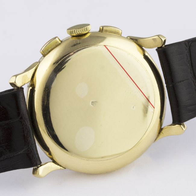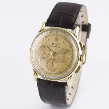A RARE GENTLEMAN'S 18K SOLID GOLD TISSOT ANTIMAGNETIC CHRONOGRAPH WRIST WATCH CIRCA 1950 D: Pink gold coloured dial with gilt dot markers, triple register recording hours, minutes & continuous seconds, outer tachymetre scale. M: Manual wind movement signed Tissot & numbered. C: Circular case with "horn" lugs, signed Tissot & numbered, 18k hallmarks, case diameter measures approx. 35mm. S: Brown leather strap. CONDITION REPORTD: Original dial in very good condition, showing signs of age. M: Working at present. C: In excellent condition, with some light scratches due to general use. S: In excellent condition. D: Dial / M: Movement / C: Case / S: Strap / B: Bracelet