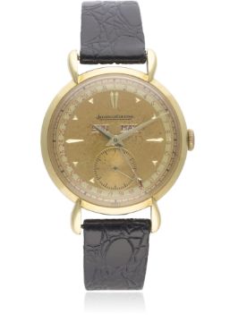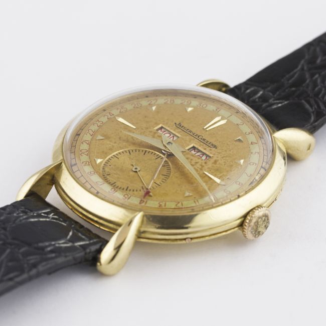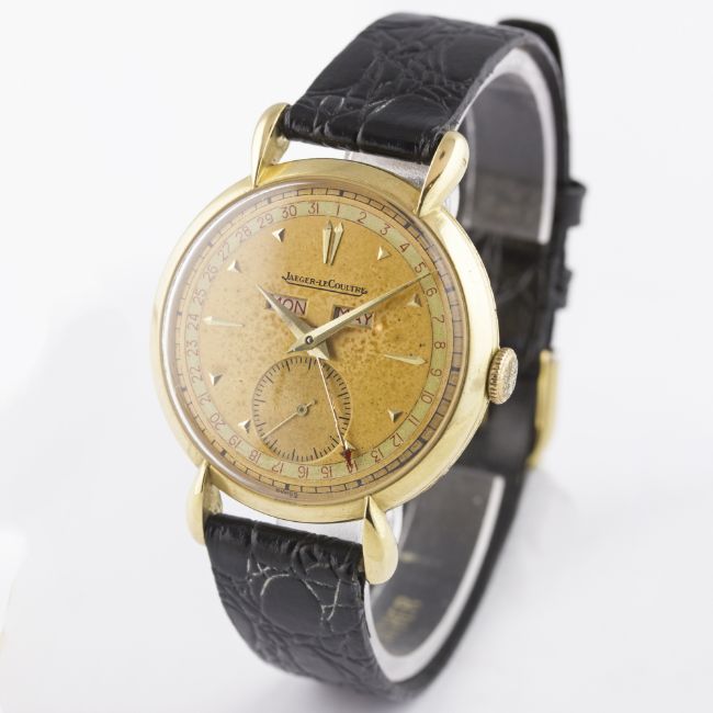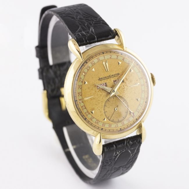 A RARE GENTLEMAN'S LARGE SIZE 18K SOLID GOLD JAEGER LECOULTRE TRIPLE CALENDAR WRIST WATCH CIRCA 1940s D: Two tone dial with gilt faceted markers & dauphine hands, day & month apertures, subsidiary seconds, outer date calendar. M: Manual wind movement signed Jaeger-LeCoultre & numbered, calibre P484/A. C: Circular case with "teardrop" lugs, signed L^C, hallmarked & numbered, case diameter measures approx. 36mm. S: Black leather strap. CONDITION REPORTD: Original dial in good condition showing signs of age. M: Working at present. C: In excellent condition with some light scratches due to general use. S: In excellent condition. D: Dial / M: Movement / C: Case / S: Strap / B: Bracelet