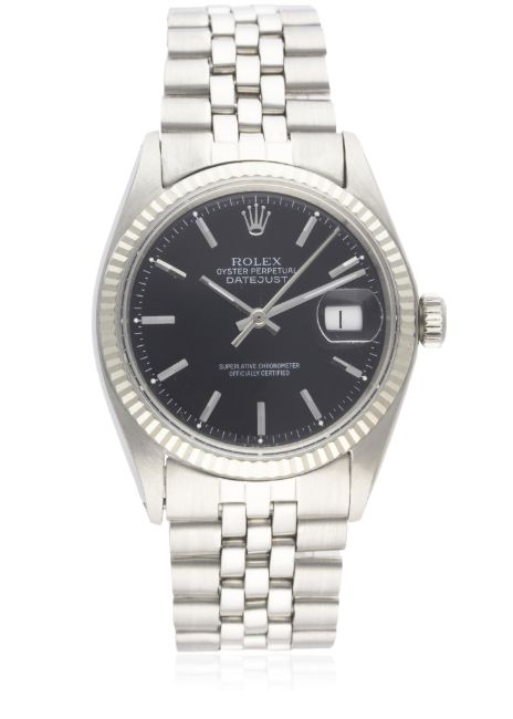 A GENTLEMAN'S STEEL & WHITE GOLD ROLEX OYSTER PERPETUAL DATEJUST BRACELET WATCH CIRCA 1971, REF. 1601 D: Black dial with silver faceted batons, date aperture. M: 26 jewel automatic chronometer movement, signed Montres Rolex S.A. & numbered, calibre 1560. C: Oyster case with solid white gold fluted bezel, signed Montres Rolex S.A., dated IV.71, numbered, Rolex crown, case diameter measures approx. 36mm. B: Rolex Jubilee bracelet, numbered 6251H and dated 3.72.  CONDITION REPORTD: Dial in excellent condition. M: Working at present. C: In excellent condition. B: In very good condition. D: Dial / M: Movement / C: Case / S: Strap / B: Bracelet