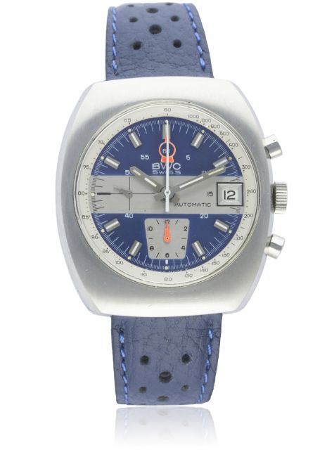 A GENTLEMAN'S STAINLESS STEEL BWC AUTOMATIC CHRONOGRAPH WRIST WATCH CIRCA 1970sD: Blue & silver dial with white inlaid batons & hands, two registers recording hours & continuous seconds, centre chronograph minute hand with aperture to display minutes elapsed, silver tachymetre inner bezel, date aperture. M: 22 jewel automatic movement signed Buttes Watch & numbered, Lemania calibre 1340. C: Tonneau shaped screw back case, numbered, case width measures approx. 40mm. S: Blue perforated leather strap. CONDITION REPORTD: Original dial in excellent condition. M: Working at present. C: In excellent condition, with some surface scratches due to occasional use. S: In excellent condition.  D: Dial / M: Movement / C: Case / S: Strap / B: Bracelet