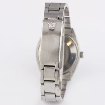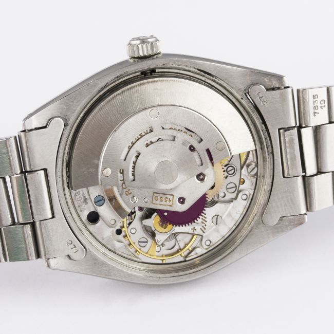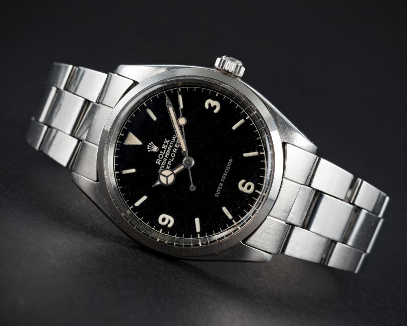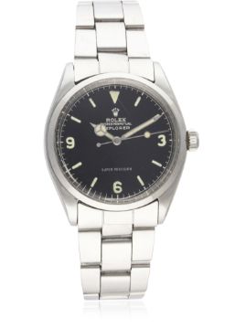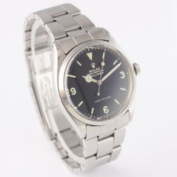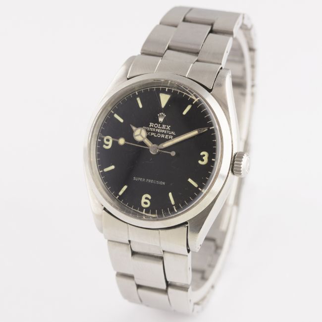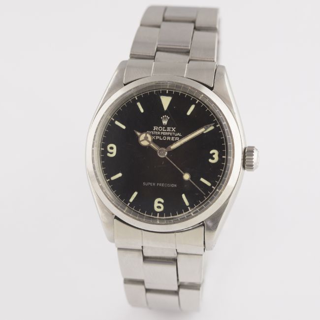 A VERY RARE GENTLEMAN'S STAINLESS STEEL ROLEX OYSTER PERPETUAL EXPLORER SUPER PRECISION BRACELET WATCH DATED 1962, REF. 5500 WITH GILT CHAPTER RING DIALD: Gloss black dial with luminous markers & 3-6-9 Arabic numerals, gilt font & chapter ring, Mercedes hands. M: 26 jewel automatic movement, signed Rolex & numbered, calibre 1530. C: Oyster case, signed Montres Rolex S.A., dated IV.62, numbered, Rolex crown, case diameter measures approx. 34mm. B: Rolex 'light' Oyster bracelet numbered 7831/19/271, dated 3/71. CONDITION REPORTD: Original dial in excellent condition . M: Working at present. C: In excellent condition with some scratches due to general use. S: In very good condition. D: Dial / M: Movement / C: Case / S: Strap / B: Bracelet