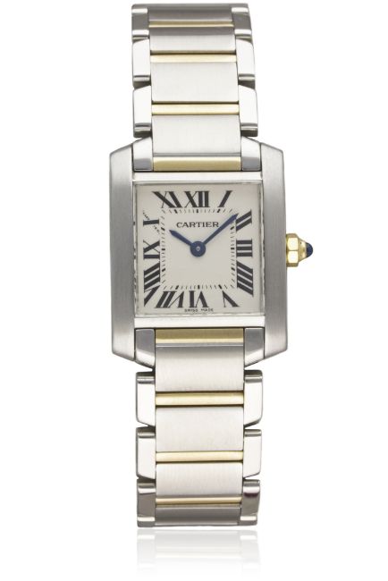 A LADIES STEEL & GOLD CARTIER TANK FRANCAISE BRACELET WATCH CIRCA 2005, REF. 2384D: Silver dial with Roman numerals, secret signature at X. M: Quartz movement signed Cartier. C: Curved square Tank case, signed Cartier & numbered, original sapphire-set gold crown, case measures approx. 26mm by 20mm. B: Original Cartier stainless steel & solid gold bracelet. CONDITION REPORTD: Original dial in excellent condition. M: Working at present. C: In excellent condition. B: In excellent condition. D: Dial / M: Movement / C: Case / S: Strap / B: Bracelet