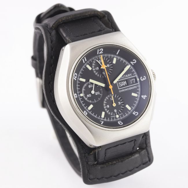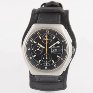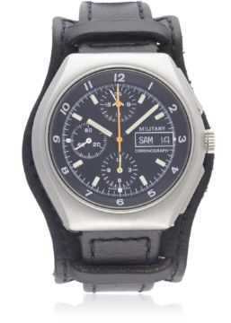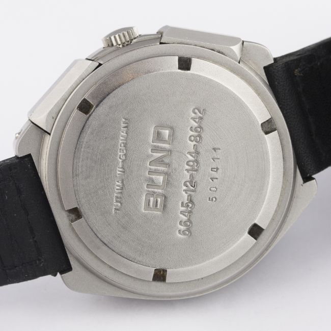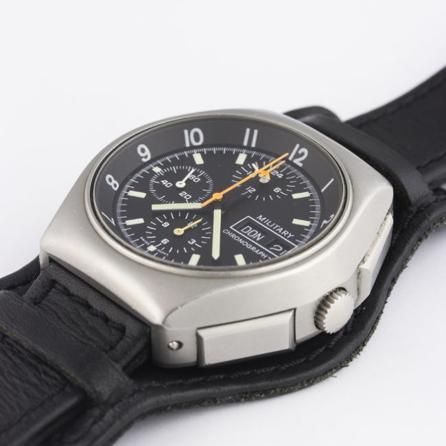 A GENTLEMAN'S STAINLESS STEEL GERMAN MILITARY TUTIMA BUND PILOTS CHRONOGRAPH WRIST WATCH CIRCA 1980s D: Black dial with luminous markers & hands, triple register recording hours, continuous seconds & 24 hour display, centre minute jet hand totaliser, day & date apertures, 12 hour inner bezel. M: Automatic movement signed Lemania Watch Ltd, calibre 5100. C: Tonneau shaped case with integrated pushers, matt finished, signed Tutima, issue markings W-Germany BUND 6645-12-194-8642 501411, case width measures approx. 43mm. S: Black leather BUND style strap. CONDITION REPORTD: Original dial in excellent condition. M: Working at present. C: In excellent condition, with some light scratches due to general use. S: In very good condition.  D: Dial / M: Movement / C: Case / S: Strap / B: Bracelet