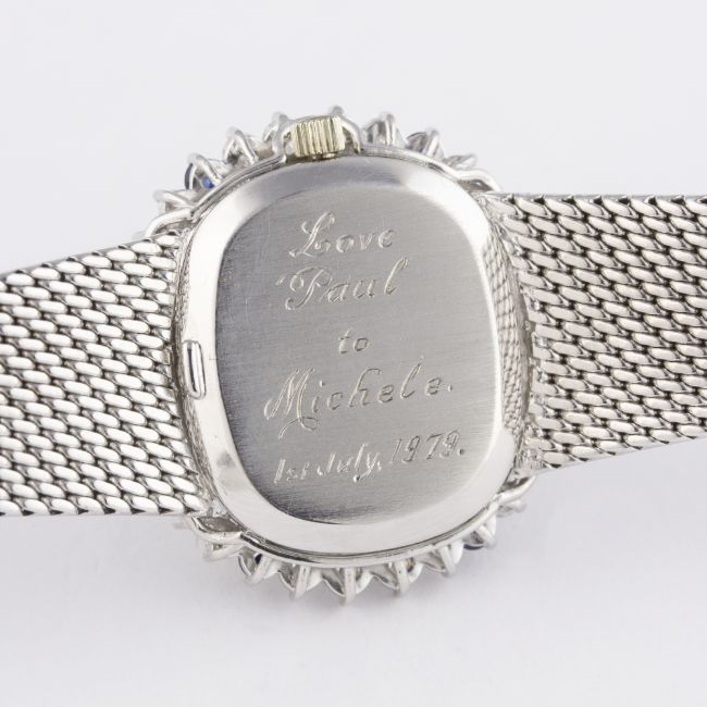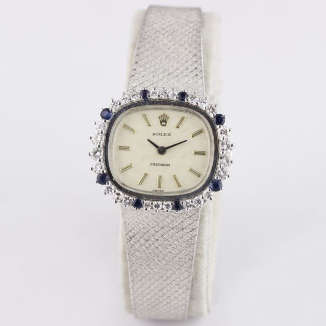 A FINE LADIES 18K SOLID WHITE GOLD, SAPPHIRE & DIAMOND ROLEX PRECISION BRACELET WATCH CIRCA 1979 D: Silver crosshatched dial with gilt batons. M: 18 jewel manual wind movement signed Rolex, calibre 1400. C: Cushion shaped case with original diamond & sapphire set bezel, signed Rolex DS&S, hallmarked & numbered, inscription to case back, Rolex crown, case width measures approx. 29mm. B: Original Rolex 18k solid white gold integral bracelet, total length measures approx. 165mm. CONDITION REPORTD: Dial in excellent condition. M: Working at present. C: In excellent condition. B: In excellent condition. D: Dial / M: Movement / C: Case / S: Strap / B: Bracelet