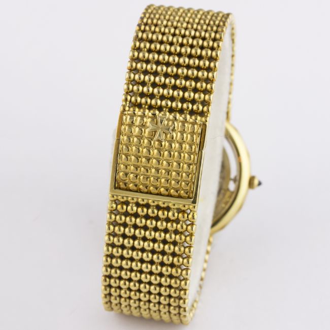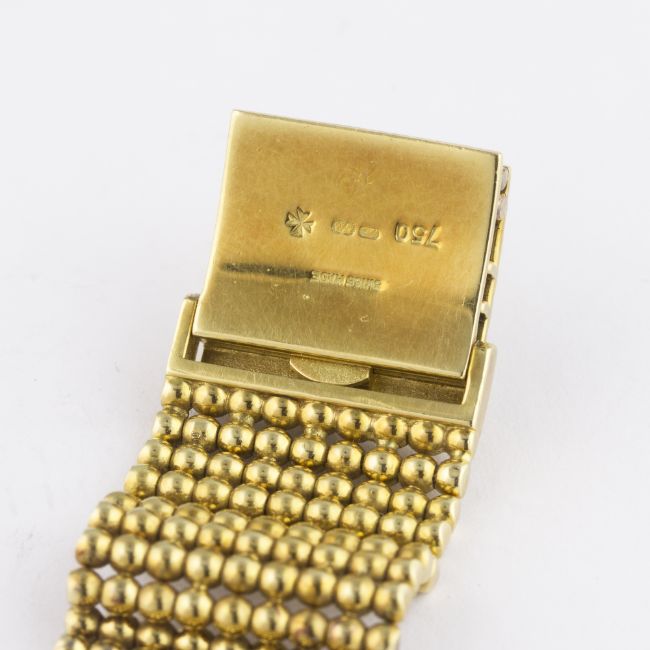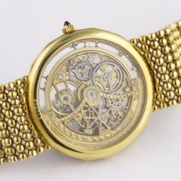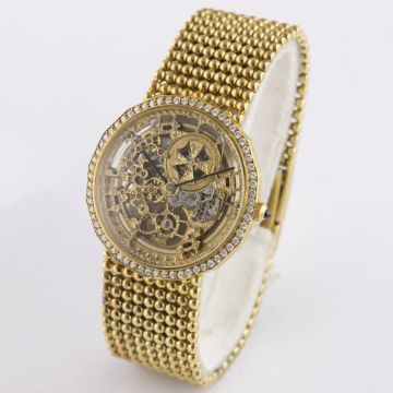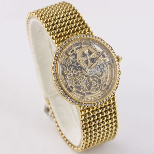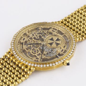 A FINE & RARE GENTLEMAN'S 18K SOLID GOLD & DIAMOND VACHERON & CONSTANTIN BRACELET WATCH CIRCA 1990 D: Chased worked skeleton dial with visible movement. M: 36 jewel automatic movement with 21k solid gold rotor weight, signed Vacheron & Constantin, numbered. C: Dodecagonal shaped case with original diamond set bezel, 18k hallmarks & numbered, sapphire crown, exhibition back, case width measures approx. 34mm. B: Original Vacheron & Constantin 18k solid gold integral bracelet, total length measures approx 175mm. CONDITION REPORTD: Original dial in excellent condition. M: Working at present. C: In excellent condition. B: In excellent condition. D: Dial / M: Movement / C: Case / S: Strap / B: Bracelet