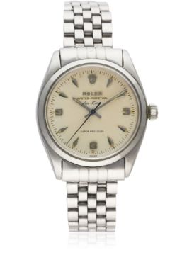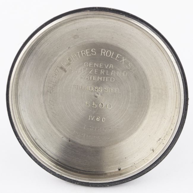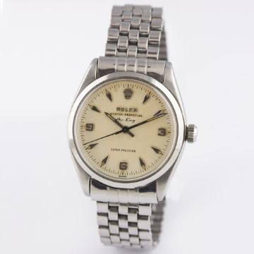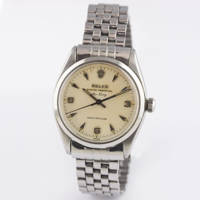 A RARE GENTLEMAN'S STAINLESS STEEL ROLEX OYSTER PERPETUAL AIR KING SUPER PRECISION BRACELET WATCH DATED 1962, REF. 5500 WITH ORIGINAL BOX, GUARANTEE AND SERVICE BOOKLET, PURCHASE RECEIPT & SERVICE PAPERWORK DATED 1979  D: Silver dial with silver "arrow head" markers & 3-6-9 Arabic numerals. M: Automatic movement signed Montres Rolex S.A. & numbered. C: Oyster case, signed Montres Rolex S.A. & numbered, Rolex crown, case diameter measures approx. 34mm. B: Rolex Jubilee bracelet, Made in England.  CONDITION REPORTD: Original dial in excellent condition, showing a nice patina and some small signs of age. M: Working at present. C: In excellent condition, with some light scratches due to general use. B: In good condition, clasp showing signs of wear.D: Dial / M: Movement / C: Case / S: Strap / B: Bracelet
