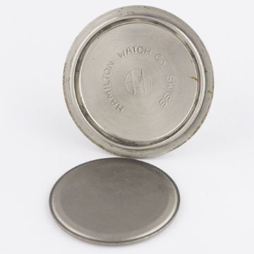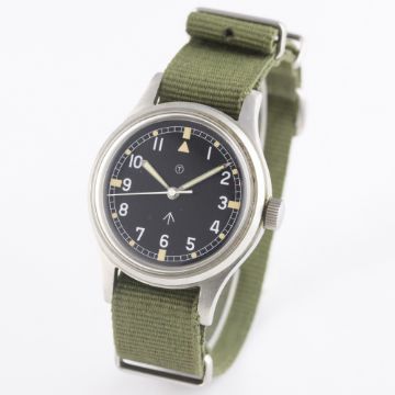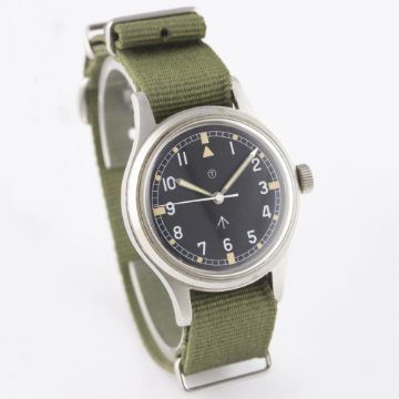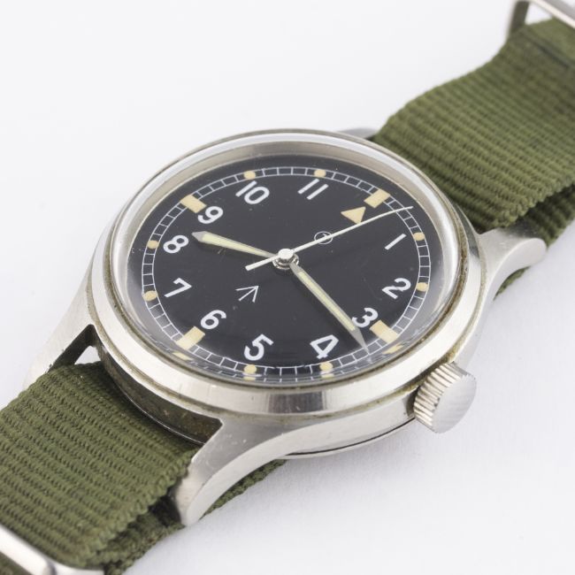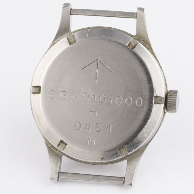A GENTLEMAN'S STAINLESS STEEL BRITISH MILITARY HAMILTON RAF PILOTS WRIST WATCH CIRCA 1960s D: Black MOD dial with Arabic numerals & tritium luminous markers, military arrow. M: 17 jewel manual wind movement signed Hamilton, calibre 75. C: Military case with fixed bars, signed Hamilton Watch Co., issue markings ^ 6B-9101000 H 0451 M, dust cover, case diameter measures approx. 36mm. S: NATO strap. CONDITION REPORTD: MOD dial in excellent condition. M: Working at present. C: In excellent condition with some scratches due to general use. S: In excellent condition. D: Dial / M: Movement / C: Case / S: Strap / B: Bracelet