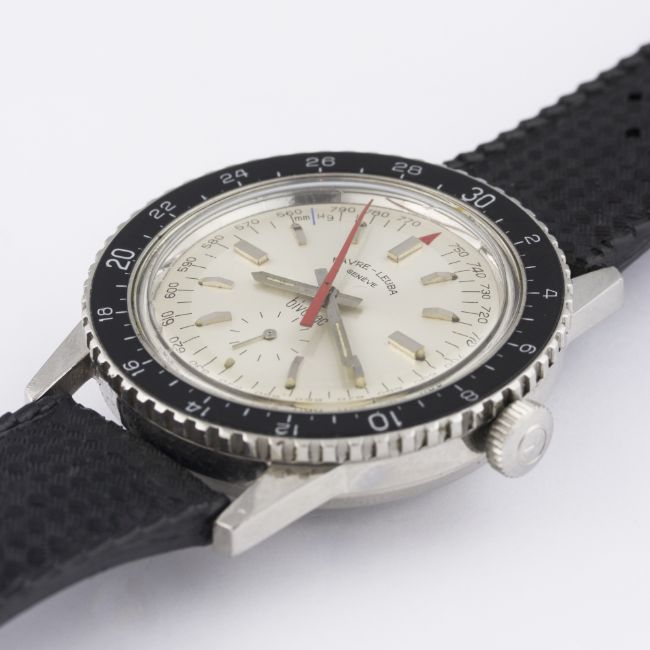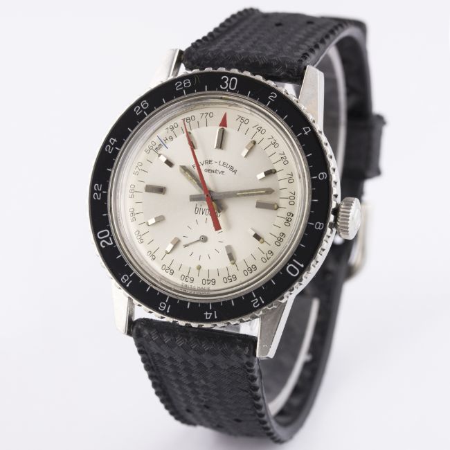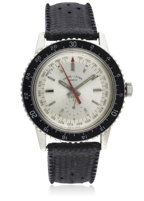 A RARE GENTLEMAN'S STAINLESS STEEL FAVRE LEUBA BIVOUAC ALTIMETER BAROMETER WRIST WATCH CIRCA 1960s, REF. 53213 D: Silver dial with faceted silver batons & hands, outer scale with red pressure gauge hand, subsidiary seconds. M: Manual wind movement signed Favre-Leuba. C: Circular case with air pressure capsule, black rotating bakelite altitude bezel, signed Bivouac Altimeter Barometer, Favre-Leuba crown, case diameter measures approx. 40mm. S: Black Tropic rubber strap. CONDITION REPORTD: Original dial in excellent condition. M: Working at present. C: In excellent condition, with some light scratches due to general use. S: In excellent condition.D: Dial / M: Movement / C: Case / S: Strap / B: Bracelet