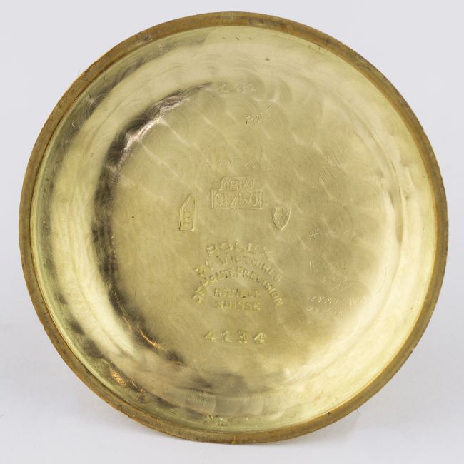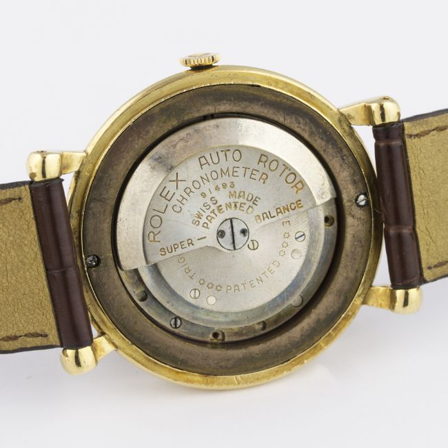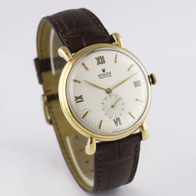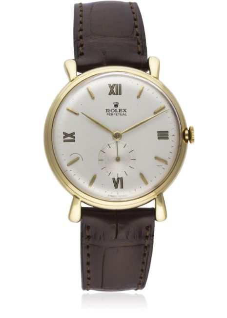 A RARE GENTLEMAN'S LARGE 18K SOLID GOLD ROLEX PERPETUAL WRIST WATCH CIRCA 1950, REF. 4134 D: Silver dial with gilt batons & quarterly Roman numerals, subsidiary seconds. M: Automatic chronometer "bubble back" movement, signed Rolex & numbered. C: Circular snap back case, signed Rolex 31 Victoires, Model Depose & numbered, 18k hallmarks, Rolex crown, case diameter measures approx. 37mm. S: Brown leather strap. CONDITION REPORTD: Dial in good condition with some light scratches. M: Working at present. C: In excellent condition. S: In fair condition. D: Dial / M: Movement / C: Case / S: Strap / B: Bracelet