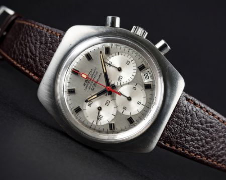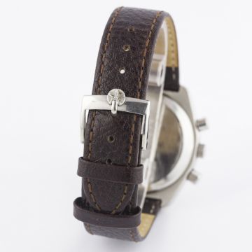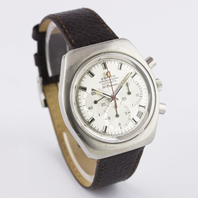 A GENTLEMAN'S STAINLESS STEEL ZENITH EL PRIMERO AUTOMATIC CHRONOGRAPH WRIST WATCH CIRCA 1971, REF. A787 D: Silver dial with part-luminous black inlaid silver batons & hands, three overlapping registers recording hours, minutes & continuous seconds, off-set date aperture, red centre chronograph hand. M: 31 jewel automatic movement signed Zenith, calibre 3019 PHC. C: Tonneau shaped case, signed Movado Zenith with emblem, numbered, Zenith crown, case width measures approx. 38mm. S: Brown leather strap with Zenith pin buckle. CONDITION REPORTD: Original dial in excellent condition, one small mark to minute register. M: Working at present. C: In very good condition, with some small scratches due to general use. S: In excellent condition. D: Dial / M: Movement / C: Case / S: Strap / B: Bracelet