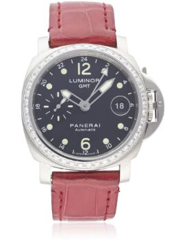 A STAINLESS STEEL 40MM PANERAI LUMINOR GMT WRIST WATCH CIRCA 2005, H SERIES LIMITED TO 800 PIECES, WITH ORIGINAL GUARANTEE CARD  D: Black dial with luminous Arabic numerals, outer 24 hour markers with dual time zone GMT hand, subsidiary seconds, date aperture. M: Automatic movement signed Panerai. C: Cushion shaped case with crown guard lock, after-set diamond bezel, signed Officine Panerai, case ref. OP 6626, numbered, case width measures approx. 40mm. S: Panerai red leather strap & deployment clasp. CONDITION REPORTD: Original dial in excellent condition. M: Working at present. C: In excellent condition. S: In very good condition. D: Dial / M: Movement / C: Case / S: Strap / B: Bracelet