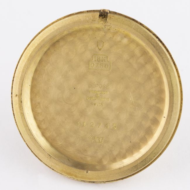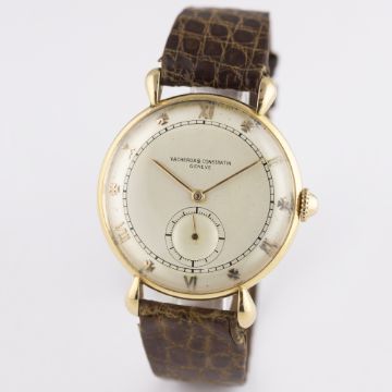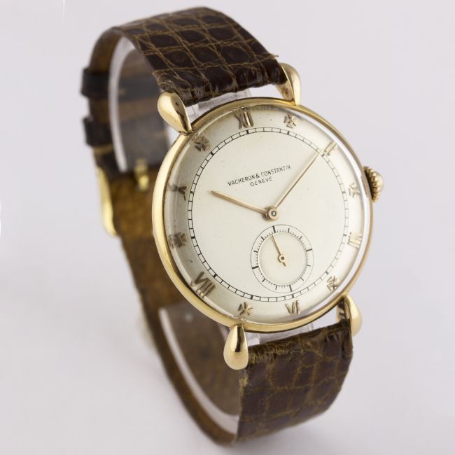 A VERY RARE GENTLEMAN'S LARGE SIZE 18K SOLID ROSE GOLD VACHERON & CONSTANTIN WRIST WATCH CIRCA 1940s D: Silver dial with bi-hourly rose gold Maltese cross markers & Roman numerals, rose gold hands, subsidiary seconds. M: 17 jewel manual wind movement signed Vacheron & Constantin, numbered, calibre V453/3C. C: Circular case with "teardrop" lugs, signed Vacheron & Constantin, hallmarked & numbered, case diameter measures approx. 36mm. S: Vacheron & Constantin leather strap & 18k solid gold pin buckle. CONDITION REPORTD: Original dial in very good condition, showing some small signs of age. M: Working at present. C: In excellent condition, with some light scratches due to general use. S: In fair condition. D: Dial / M: Movement / C: Case / S: Strap / B: Bracelet