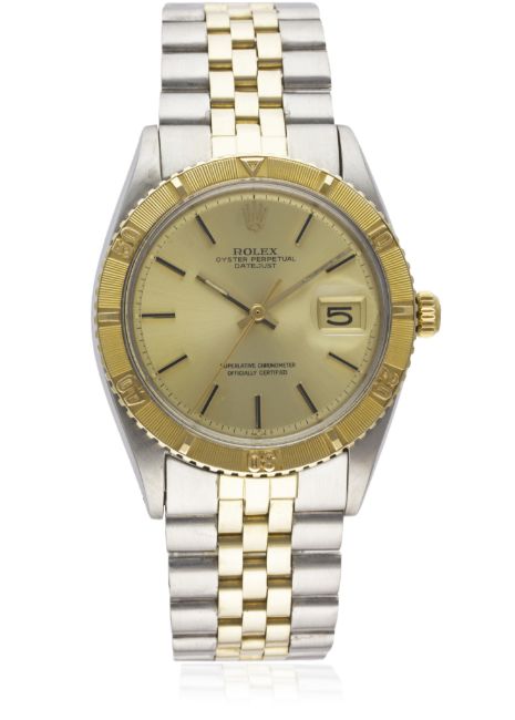 A RARE GENTLEMAN'S STEEL & GOLD ROLEX OYSTER PERPETUAL DATEJUST "TURNOGRAPH" BRACELET WATCH CIRCA 1971, REF. 1625 D: Champagne dial with black inlaid gilt batons, date aperture. M: 26 jewel automatic chronometer movement, signed Montres Rolex S.A. & numbered, calibre 1570. C: Oyster case with solid gold rotating 60 minute "thunderbird" bezel, signed Montres Rolex S.A., dated I.71, numbered, Rolex crown, case diameter measures approx. 36mm. B: Original Rolex Jubilee steel & solid gold bracelet, numbered 6252H14, dated 1.72. CONDITION REPORTD: Original dial in excellent condition. M: Working at present. C: In excellent condition. B: In excellent condition. D: Dial / M: Movement / C: Case / S: Strap / B: Bracelet