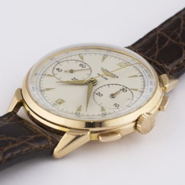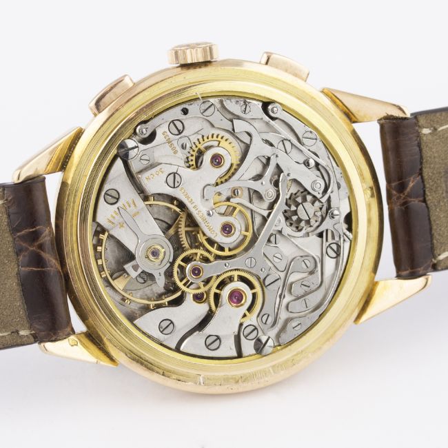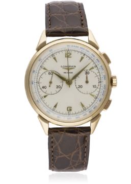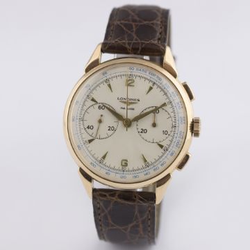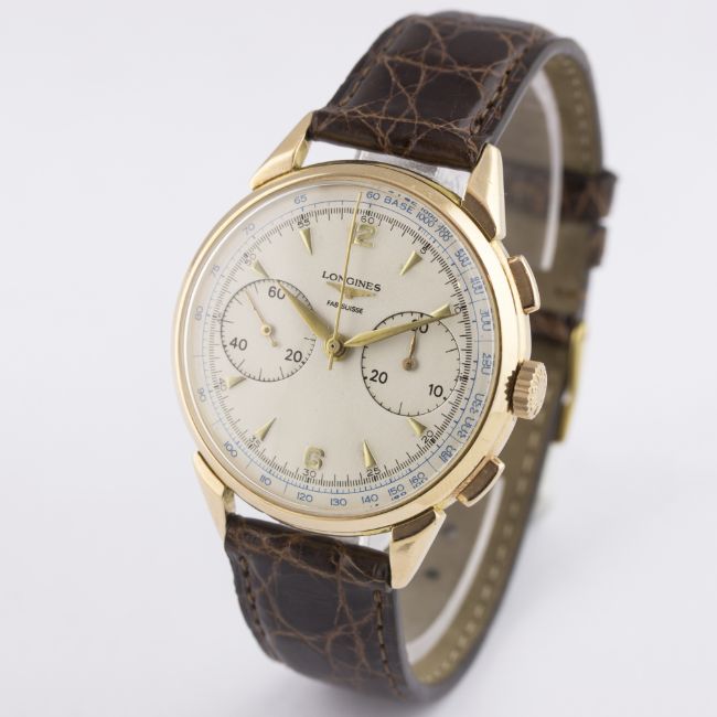 A GENTLEMAN'S 18K SOLID ROSE GOLD LONGINES FLYBACK CHRONOGRAPH WRIST WATCH CIRCA 1950, WITH A COPY OF EMAIL CORRESPONDENCE FROM LONGINES DETAILING ITS PRODUCTION D: Silver dial with gilt "dagger" batons & hands, double register recording minutes & continuous seconds, blue outer tachymetre scale, inner minute track. M: 18 jewel manual wind movement signed Longines & numbered, calibre 30CH. C: Circular case with faceted lugs, signed Longines, hallmarked, case diameter measures approx. 37mm. S: Brown leather strap. CONDITION REPORTD: Dial in excellent condition. M: Working at present. C: In excellent condition, with some surface scratches due to general use. S: In very good condition. D: Dial / M: Movement / C: Case / S: Strap / B: Bracelet