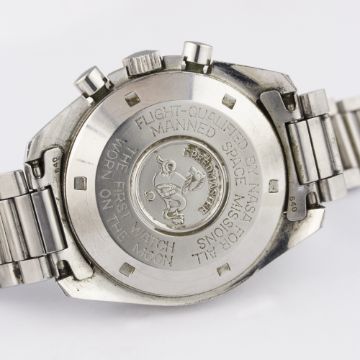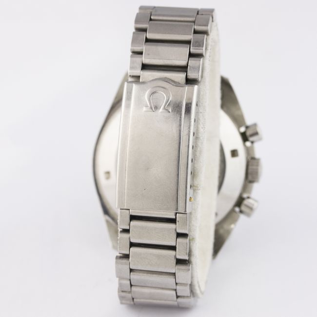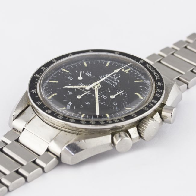 A GENTLEMAN'S STAINLESS STEEL OMEGA SPEEDMASTER PROFESSIONAL CHRONOGRAPH BRACELET WATCH CIRCA 1970s, REF. 145022-74 ST D: Black dial with luminous markers & hands, triple register recording hours, minutes & continuous seconds. M: 17 jewel manual wind movement, signed Omega & numbered, calibre 861. C: Circular case with tachymetre bezel, signed Omega Watch Co., NASA moon landing tribute on case back, dust cover, Omega crown, case diameter measures approx. 42mm. B: Omega Speedmaster heavy flat link bracelet, numbered (No.12) 1175/640 and dated 1.71. CONDITION REPORTD: Original dial in excellent condition, luminous showing some patina. M: Working at present. C: In excellent condition with some scratches and makes due to general use. S: In very good condition with some scratches due to general use. D: Dial / M: Movement / C: Case / S: Strap / B: Bracelet