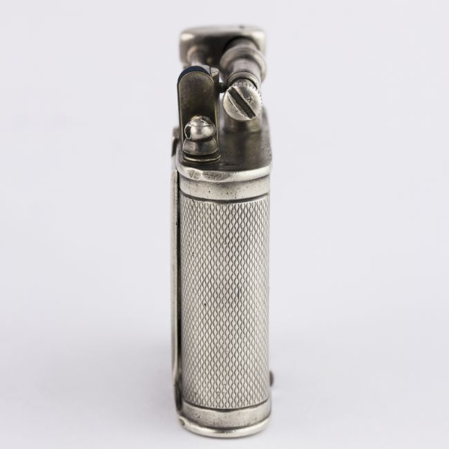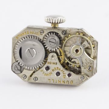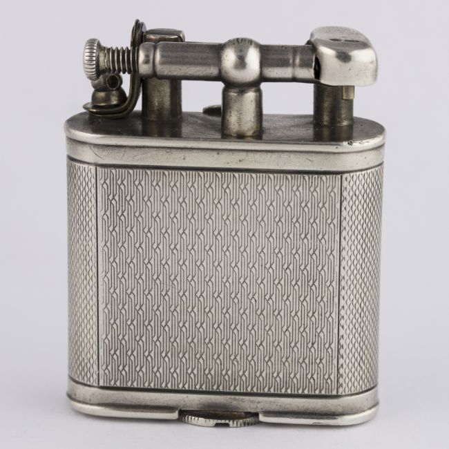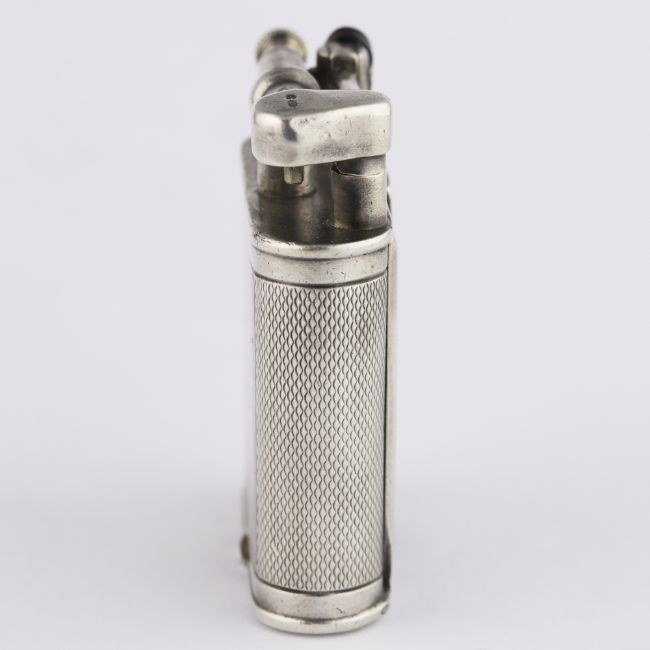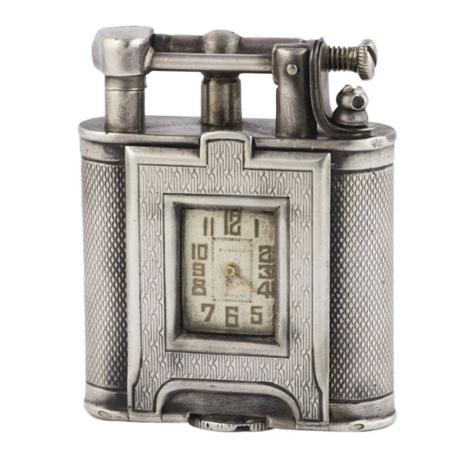 A RARE SOLID SILVER DUNHILL UNIQUE WATCH LIGHTER CIRCA 1930, REF. 821 D: Silver dial with gilt Arabic numerals. M: 15 jewel manual wind movement, signed Dunhill. C: Engine turned case signed Dunhill Swizerland, hallmarks, patent number, roller mechanism with a straight hinged arm, watch set in the centre of the case housed in a hinged door, measures approx. 46mm by 37mm. CONDITION REPORTD: Dial in fair condition. M: Working at present. C: In very good condition. D: Dial / M: Movement / C: Case / S: Strap / B: Bracelet
