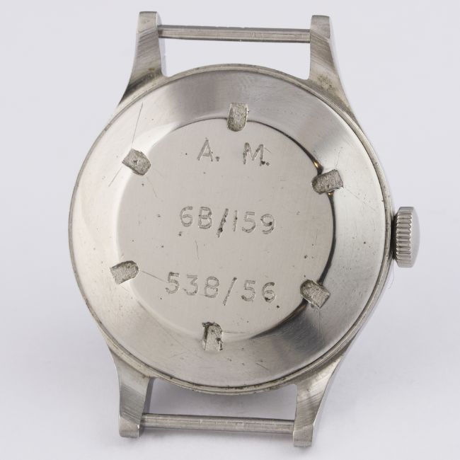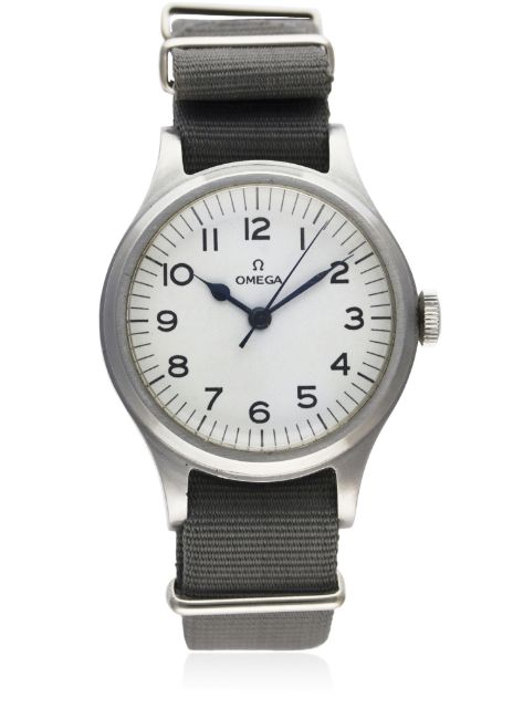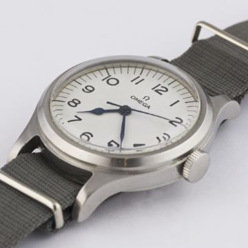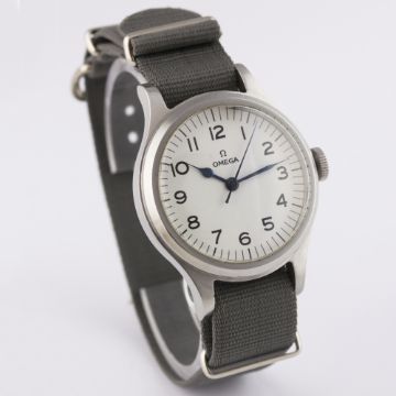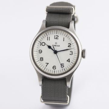 A GENTLEMAN'S STAINLESS STEEL BRITISH MILITARY OMEGA RAF PILOTS WRIST WATCH DATED 1956 D: White dial with black Arabic numerals. M: 16 jewel manual wind movement signed Omega & numbered, calibre 30T2SC. C: Military case with fixed bars, issue markings A.M. 6B/159 538/56, inner ring, case diameter measures approx. 36mm. S: NATO strap. CONDITION REPORTD: MOD dial in excellent condition, showing some small signs of age. M: Working at present. C: In excellent condition, with some light scratches due to use. S: In excellent condition. D: Dial / M: Movement / C: Case / S: Strap / B: Bracelet