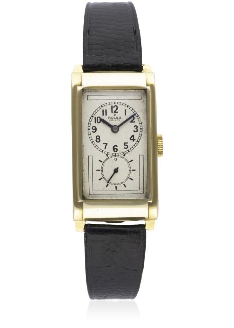 A GENTLEMAN'S 9CT SOLID GOLD ROLEX PRINCE WRIST WATCH CIRCA 1930s, REF. 1862 D: Silver dial with Arabic numerals & subsidiary seconds, blue steel hands. M: 18 jewel manual wind Ultra Prima Chronometer movement, signed Rolex Timed 6 Positions & numbered. C: Art Deco style rectangular case, signed Rolex 25 Records Universels, hallmarked & numbered, top case numbered matches case back, case measures approx. 35mm by 20mm. S: Black leather strap. CONDITION REPORTD: Dial in very good condition. M: Working at present. C: In very good condition with some light scratches and wear due to general use. S: In very good condition. D: Dial / M: Movement / C: Case / S: Strap / B: Bracelet