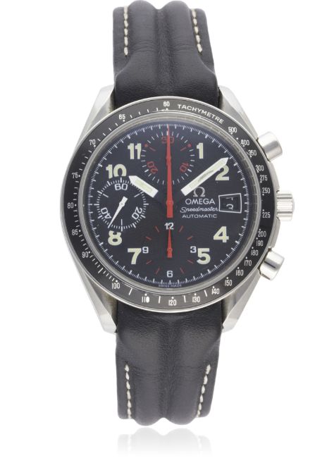 A GENTLEMAN'S STAINLESS STEEL OMEGA SPEEDMASTER AUTOMATIC CHRONOGRAPH WRIST WATCH CIRCA 2000 D: Black dial with luminous Arabic numerals & hands, triple register recording hours, minutes & continuous seconds, date aperture. M: Automatic movement signed Omega & numbered. C: Circular case with tachymetre bezel, signed Omega Watch Co., Speedmaster emblem embossed on case back & numbered, Omega crown, case diameter measures approx. 40mm. S: Omega black leather strap & pin buckle. CONDITION REPORTD: Original dial in excellent condition, some marks on the luminous of the hands. M: Working at present. C: In very good condition, with some light scratches due to general use. S: In good condition. D: Dial / M: Movement / C: Case / S: Strap / B: Bracelet
