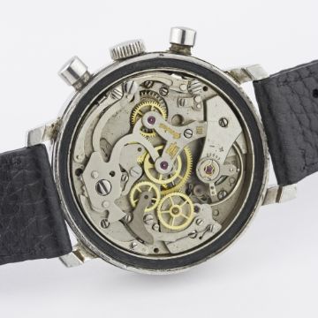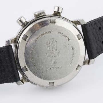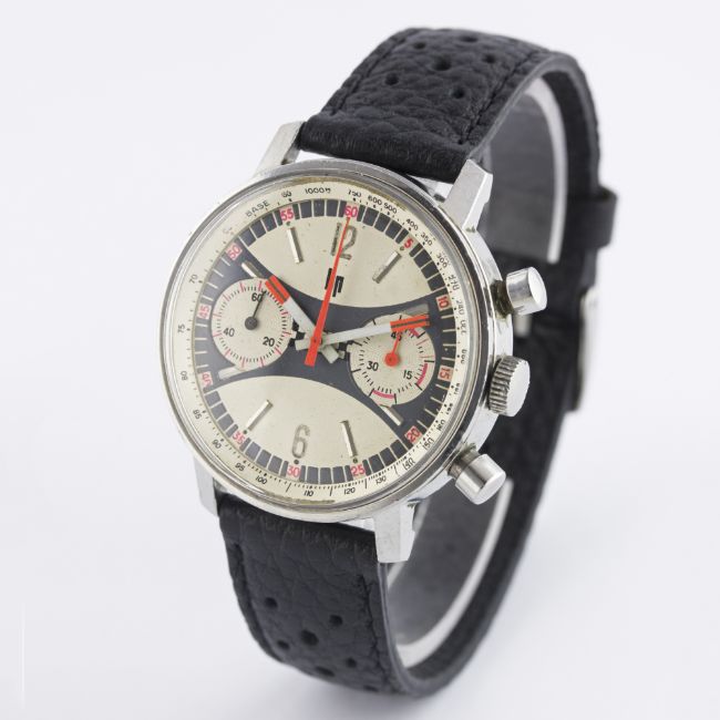A RARE GENTLEMAN'S LARGE SIZE STAINLESS STEEL LIP CHRONOGRAPH WRIST WATCH CIRCA 1970 D: Silver & blue dial with chequered flag to centre, silver Arabic numerals & batons, double register recording minutes & continuous seconds, orange & white hands, outer tracking with pink numerals, silver tachymetre inner bezel. M: 17 jewel manual wind movement signed Lip Geneve, Valjoux calibre 7730. C: Circular screw back case, signed Lip with crest, numbered, case diameter measures approx. 37mm. S: Black perforated leather strap. CONDITION REPORTD: Original dial in excellent condition, showing some small signs of age. M: Working at present. C: In very good condition, with some small scratches due to general use. S: In excellent condition. D: Dial / M: Movement / C: Case / S: Strap / B: Bracelet