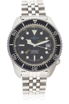 A RARE GENTLEMAN'S STAINLESS STEEL FRENCH MILITARY MARINE NATIONALE AVRICOSTE SPIROTECHNIQUE PROFESSIONAL 200 AUTOMATIC DIVERS BRACELET WATCH CIRCA 1970,  ISSUED TO THE BREST ARSENAL D: Black dial with luminous markers, date aperture. M: 17 jewel automatic movement, calibre 2824.2. C: Tonneau shaped screw back case with 60 minute rotating bezel, M.N. issue numbers 1133B, screw-down crown, numbered, case width measures approx. 42mm. B: Original Avricoste stainless steel bracelet.CONDITION REPORTD: Original dial in excellent condition. M: Working at present. C: In excellent condition with some light scratches due to general use. B: In excellent condition with some light scratches due to general use.  D: Dial / M: Movement / C: Case / S: Strap / B: Bracelet