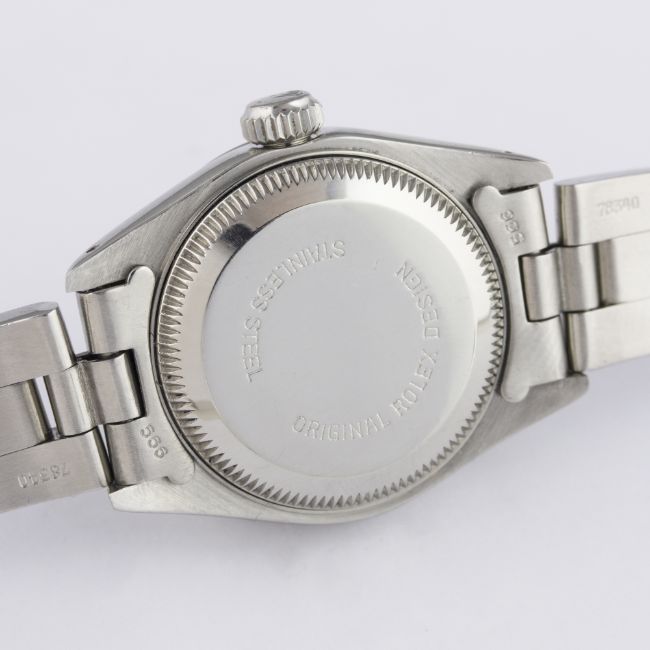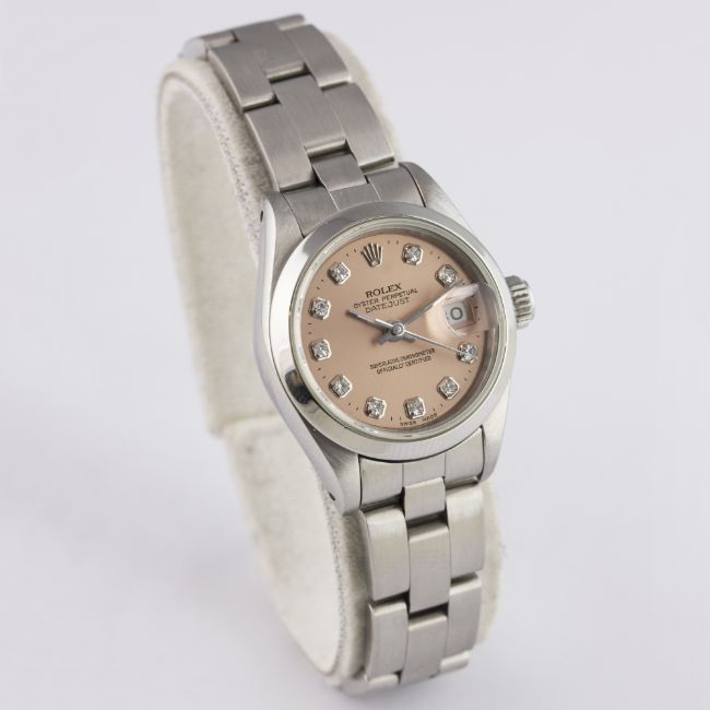 A LADIES STAINLESS STEEL ROLEX OYSTER PERPETUAL DATEJUST BRACELET WATCH CIRCA 1987, REF. 69160 D: Salmon pink dial with diamond markers, date aperture. M: 29 jewel automatic chronometer movement with quick-set date, signed Rolex & numbered, calibre 2135. C: Oyster case with smooth bezel, sapphire crystal, signed Montres Rolex S.A., Rolex crown, case diameter measures approx. 26mm. B: Original Rolex Oyster bracelet, numbered 78340/566. CONDITION REPORTD: Original dial in excellent condition. M: Working at present. C: In excellent condition. B: In excellent condition. D: Dial / M: Movement / C: Case / S: Strap / B: Bracelet