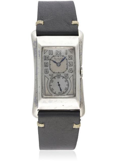 A RARE GENTLEMAN'S SOLID SILVER ROLEX PRINCE BRANCARD WRIST WATCH CIRCA 1930s, REF. 971U D: Two tone silver dial with Arabic numerals, subsidiary seconds, blue steel hands. M: 15 jewel manual wind Extra Prima movement, signed Rolex Timed 6 Positions, Observatory Quality & numbered C: Flared rectangular case, signed Rolex 25 World's Records, silver hallmarks & numbered, top case numbers match case back, case measures approx. 44mm by 26mm at its widest point. S: Black leather strap. CONDITION REPORTD: Dial in very good condition. M: Working at present. C: In very good condition. S: In excellent condition. D: Dial / M: Movement / C: Case / S: Strap / B: Bracelet