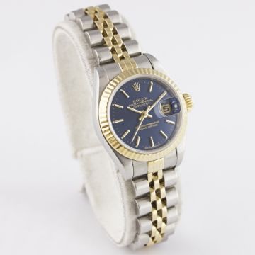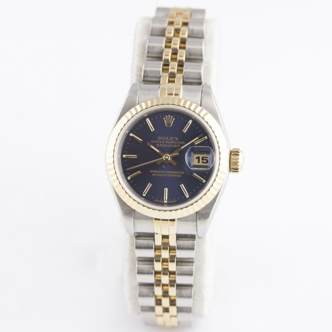 A LADIES STEEL & GOLD ROLEX OYSTER PERPETUAL DATEJUST BRACELET WATCH CIRCA 2000, REF. 79173 D: Blue dial with gilt batons & hands, date aperture. M: 31 jewel automatic chronometer movement with quick-set date, signed Rolex S.A. & numbered, calibre 2235. C: Oyster case with solid gold fluted bezel, sapphire crystal, signed Montres Rolex S.A., P serial no., Rolex crown, case diameter measures approx. 26mm. B: Original Rolex Jubilee steel & solid gold bracelet, numbered AB11/62523D-18. CONDITION REPORTD: Original dial in excellent condition. M: Working at present. C: In excellent condition, with some light scratches due to general use. B: In very good condition, with some light scratches due to general use. D: Dial / M: Movement / C: Case / S: Strap / B: Bracelet