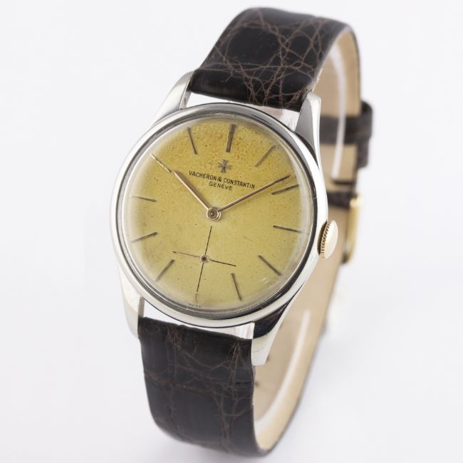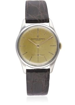 A RARE GENTLEMAN'S STAINLESS STEEL VACHERON & CONSTANTIN WRIST WATCH CIRCA 1950s, REF. 4066 D: Silver dial with pink gold batons & hands, subsidiary seconds. M: 17 jewel manual wind movement signed Vacheron & Constantin, numbered, calibre P453/3B. C: Circular case, signed Vacheron & Constantin, numbered, solid pink gold crown, case diameter measures approx. 34mm. S: Brown leather strap. CONDITION REPORTD: Original dial in very good condition, showing a strong patina. M: Working at present. C: In excellent condition, with some light scratches due to general use. S: In excellent condition. D: Dial / M: Movement / C: Case / S: Strap / B: Bracelet