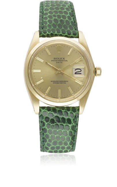 A RARE GENTLEMAN'S 18K SOLID GOLD ROLEX OYSTER PERPETUAL DATE WRIST WATCHCIRCA 1960s, REF. 1500Movement: 26J, automatic chronometer, cal. 1560, signed Montres Rolex S.A., numbered.Case: Diameter approx. 35mm, Oyster case, signed Montres Rolex S.A., numbered, 18k hallmarks, smooth bezel, Rolex crown.Strap: Leather. CONDITION REPORTDial: Original dial in excellent condition.Movement: Working at present.Case: In excellent condition, with some light scratches due to general use.Strap/Bracelet: In excellent condition.