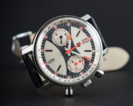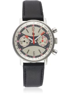 A RARE GENTLEMAN'S LARGE SIZE STAINLESS STEEL LIP CHRONOGRAPH WRIST WATCH CIRCA 1970, WITH "EXOTIC" DIALMovement: 17J, manual wind, Valjoux cal. 7730, signed Lip Geneve. Case: Diameter approx. 37mm, screw back, signed Lip with crest, numbered.Strap: Leather.  CONDITION REPORTDial: Original dial in excellent condition, showing some very small signs of age.Movement: Working at present.Case: In excellent condition, with some light scratches due to general use.Strap/Bracelet: In excellent condition.