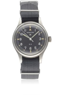 A RARE GENTLEMAN'S STAINLESS STEEL BRITISH MILITARY D.O.S. HAMILTON GENERAL SERVICE TROPICALIZED PILOTS WRIST WATCH DATED 1971, REF. 75003-3 ISSUED TO THE DIRECTORATE OF OVERSEAS SURVEYS (D.O.S.), A DEPARTMENT RESPONSIBLE FOR THE MAPPING OF PARTS OF THE BRITISH EMPIRE AND COMMONWEALTH USING ARIEL PHOTOGRAPHYMovement: Manual wind, hacking seconds, signed Hamilton.Case: Diameter approx. 36mm, screw back, fixed bars, signed Hamilton Watch Case Co, numbered, issue markings ^ 150 CE D.O.S.Strap: NATO. CONDITION REPORTDial: Original dial in excellent condition.Movement: Working at present.Case: In excellent condition, with some light scratches due to use.Strap/Bracelet: In excellent condition.