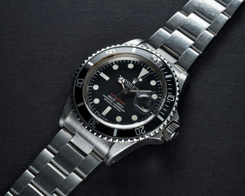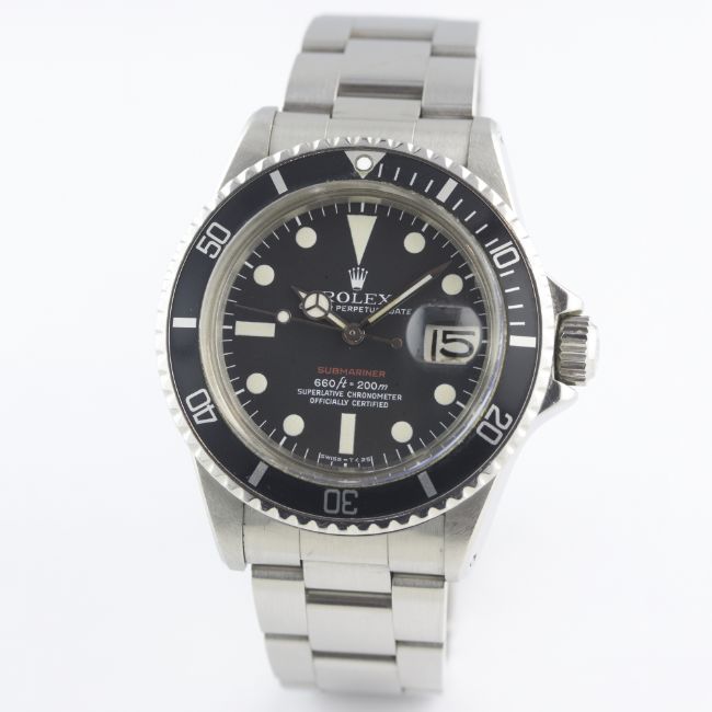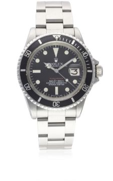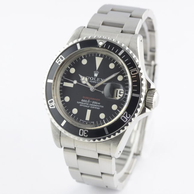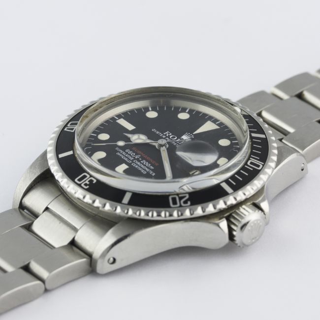 A RARE GENTLEMAN'S STAINLESS STEEL ROLEX OYSTER PERPETUAL DATE "RED WRITING" SUBMARINER BRACELET WATCHCIRCA 1971, REF. 1680 WITH MARK V DIAL Movement: 26J, automatic chronometer, cal. 1570, signed Montres Rolex S.A., numbered.Case: Diameter approx. 40mm, Oyster case, signed Montres Rolex S.A., dated III.71, numbered, 60 minute rotating bezel, Rolex triplock crown.Bracelet: Rolex Oyster Submariner bracelet, numbered MA11/91350/501B. CONDITION REPORTDial: Original dial in excellent condition, with some very small signs of age.Movement: Working at present.Case: In excellent condition, with some small scratches due to general use.Strap/Bracelet: In excellent condition, with light scratches.