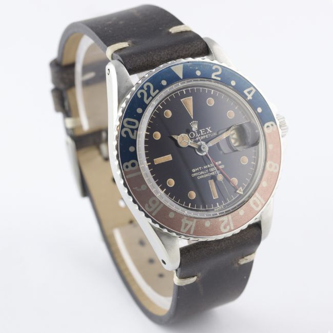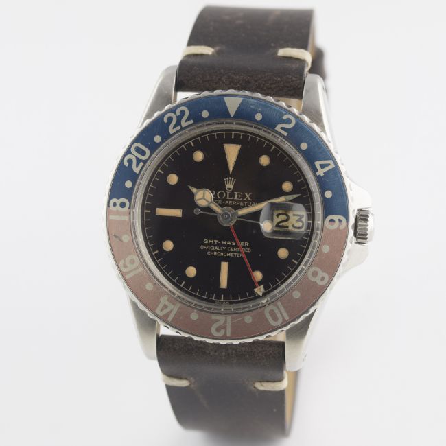 AN EXTREMELY RARE GENTLEMAN'S STAINLESS STEEL ROLEX OYSTER PERPETUAL GMT MASTER WRIST WATCHCIRCA 1960, REF. 1675 POINTED CROWN GUARDS WITH "OCC" GILT CHAPTER RING DIAL, THE FIRST VERSION OF THE REFERENCE 1675 TO BE PRODUCEDMovement: 25J, automatic chronometer, "butterfly" rotor, cal. 1560, signed Montres Rolex S.A., numbered.Case: Diameter approx. 40mm, Oyster case, signed Montres Rolex S.A., dated I.60, numbered, pointed crown guards, 24 hour rotating "Pepsi' bezel, Rolex crown.Strap: Leather. * This lot was consigned by a vendor in the USA so there will be 20% import duty applicable to the final hammer price if the watch is purchased by a bidder in the UK or EU. If the watch is purchased by a bidder from outside of the UK or EU, then only the import duty applicable in the winning bidder's country will apply to the overall price of the watch (hammer price + buyer’s premium excl. VAT). If the watch is purchased by a bidder in the USA then there will be no import duty. CONDITION REPORTDial: Original dial in very good condition, showing some signs of age, dial colour turning brown.Movement: Working at present.Case: In very good condition, with some general wear & light scratches due to use & age.Strap/Bracelet: In very good condition.