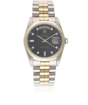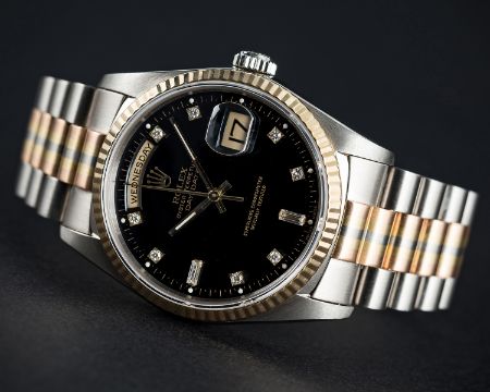 A FINE & RARE GENTLEMAN'S THREE COLOUR 18K SOLID GOLD ROLEX OYSTER PERPETUAL TRIDOR DAY DATE PRESIDENT BRACELET WATCHCIRCA 1989, REF. 18239B WITH BLACK DIAMOND DIALMovement: Automatic chronometer, quick-set day & date, signed Rolex S.A., numbered.Case: Diameter approx. 36mm, Oyster case, signed Montres Rolex S.A., 18k hallmarks, L serial no., fluted bezel, sapphire crystal, Rolex crown.Bracelet: Original three colour 18k solid gold Rolex Tridor President bracelet. CONDITION REPORTDial: Original dial in excellent condition.Movement: Working at present.Case: In excellent condition.Strap/Bracelet: In excellent condition.