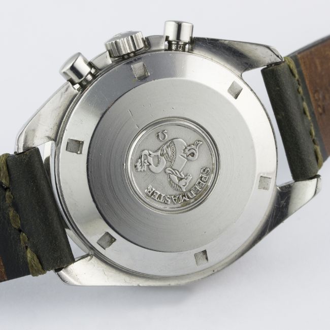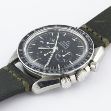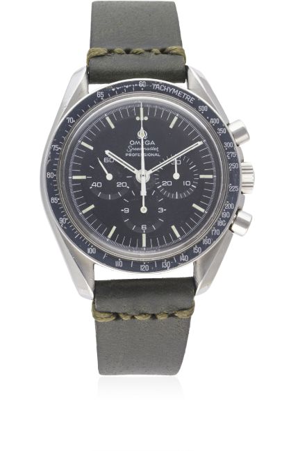 A VERY RARE GENTLEMAN'S STAINLESS STEEL OMEGA SPEEDMASTER PROFESSIONAL CHRONOGRAPH WRIST WATCH DATED 1971, REF. 145.022-71 ST WITH "NO NASA" CASE BACK, ACCOMPANIED BY OMEGA EXTRACT OF THE ARCHIVES Movement: 17J, manual wind, cal. 861, signed Omega, numbered. Case: Width approx. 42mm, screw back, Speedmaster emblem embossed on case back, signed Omega Watch Co, tachymetre bezel faded to blue/grey, dust cover, Omega crown.Strap: Leather. Believed to have been produced for a very short period in which Omega were awaiting approval from NASA's public affairs department for their intended change to the 'Flight-Qualified by NASA For All Space Missions' case back from the former "Straight Writing" case back. This resulted in a small number of watches produced without mention of NASA on the case back. CONDITION REPORTDial: Original dial in good condition, showing some signs of age.Movement: Working at present.Case: In excellent condition, with some small scratches due to general use.Strap/Bracelet: In excellent condition.