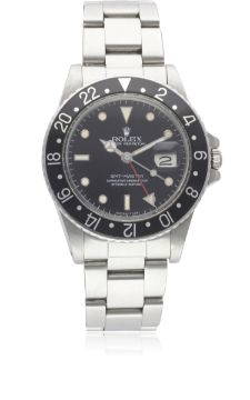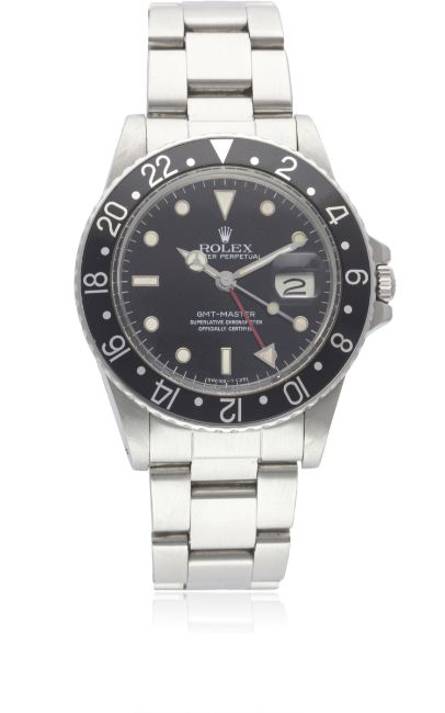 A GENTLEMAN'S STAINLESS STEEL ROLEX OYSTER PERPETUAL GMT MASTER BRACELET WATCHCIRCA 1984, REF. 16750 "TRANSITIONAL" MODELMovement: 27J, automatic chronometer, quick-set date, cal. 3075, signed Rolex S.A., numbered.Case: Diameter approx. 40mm, Oyster case, signed Montres Rolex S.A., numbered, 24 hour rotating "all black' bezel, plexiglass, Rolex crown.Bracelet: Rolex Oyster bracelet, numbered 78360/580. CONDITION REPORTDial: Original dial in excellent condition.Movement: Working at present.Case: In excellent condition, with some light scratches due to general use.Strap/Bracelet: In very good condition, with light scratches due to general use.